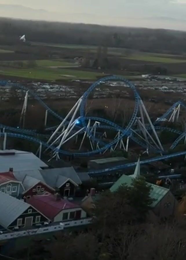 n amusement park, possibly located in a European country, as indicated by the architecture of the buildings. The dominant feature is a modern roller coaster with a white support structure and blue tracks. The roller coaster has multiple loops and twists. The buildings below appear to be styled in a traditional European manner, featuring sloped roofs. In the background, there's a field and trees. Cars are parked in the distance, suggesting a parking area for the amusement park. The sky is overcast, and the lighting indicates that it might be late afternoon. Two people are briefly mentioned by name.