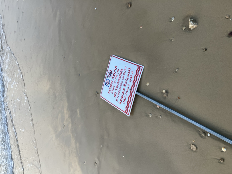 This image captures a close-up, upward-angled view of a beach in Tel-Aviv, Israel. The central subject is a white rectangular warning sign with a red border, angled slightly upwards and to the left, secured to a grey metallic pole partially embedded in the wet, light brown sand. The sign displays prohibitive text in three languages: Hebrew, English, and Arabic. The English text reads "NO SWIMMING!" and "NO LIFEGUARD ON DUTY". Above the text, two circular icons are present: a 'no swimming' symbol (a swimmer with a diagonal red line) and a 'no lifeguard' symbol (a lifeguard float with a diagonal red line). The immediate environment consists of wet, reflective sand with numerous small, scattered pebbles, shells, and darker stones. In the background, gentle ocean waves with visible white foam are breaking towards the shore. The light appears diffused, possibly indicating an overcast sky, which is reflected on the wet sand. No individuals, specific actions, or interactions are visible in the scene.