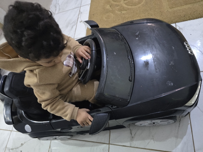 - "A child with dark, curly hair, wearing a beige hooded jumpsuit, is seated inside a black plastic toy car with an Audi logo on the front grille" by FM-Gdkzo1, licensed under CC BY 4.0