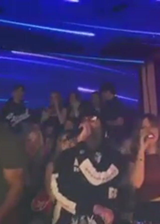 group of people in what appears to be a nightclub or a private party. There are several people on what looks like a stage, one woman is singing into a microphone, a man to her left is dancing and another man in the middle appears to be speaking into a microphone. Behind them is a crowd of people, some are holding up their phones. The lighting is dark with neon blue and pink lights illuminating the scene. There is a striped tent-like structure visible in the background. The overall atmosphere suggests a lively and energetic event.