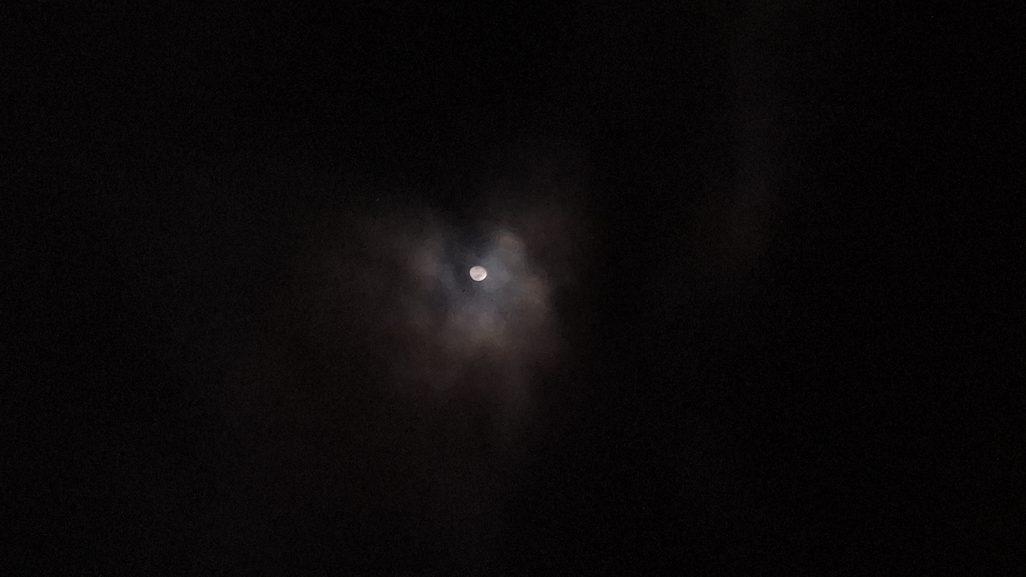 A low-angle shot captures a full moon, partially obscured by clouds, against a dark night sky