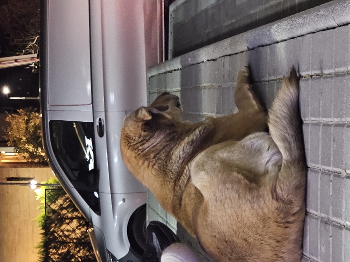 This image displays a nighttime urban scene in Sandanski, Bulgaria. A large, medium-brown dog with a thick coat is centrally positioned, sitting on a light gray tiled sidewalk. The dog's back is oriented towards the viewer, with its head turned to the right, suggesting it is observing something outside the frame. In the lower-left foreground, a partial view of a human's left foot, wearing a black athletic shoe with a white sole, is visible. In the background, a silver Mercedes-Benz Vito/V-Class cargo van is parked parallel to the sidewalk. Beyond the vehicle, a dark metal fence, green foliage, and several artificial light sources, including a distinct streetlamp, illuminate the area. A concrete curb runs along the right side of the sidewalk, defining its edge.