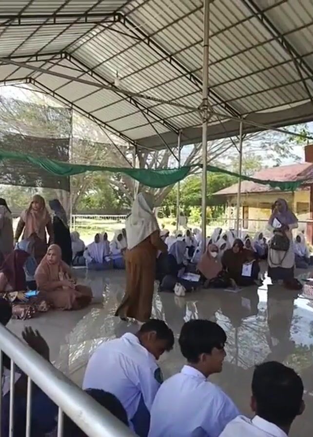 group of students and teachers gathered under a large, open-sided structure with a metal roof. The students are sitting on the tiled floor, facing two teachers who appear to be addressing them. Most of the students are wearing white tops and dark bottoms, while the teachers are wearing brown clothing and hijabs. One teacher is holding a microphone. Behind the structure, a single-story building with a red tile roof is visible. The overall setting suggests an outdoor gathering at a school or similar institution. There is another man holding what appears to be a camera.