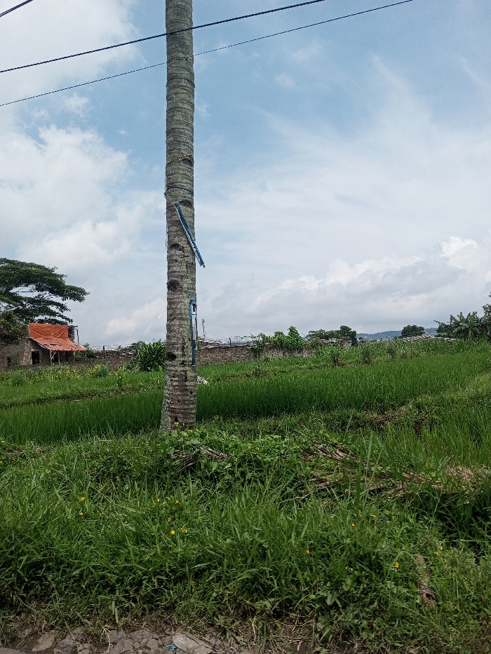 This image depicts a daytime exterior scene in Vieng Phouka, Laos, characterized by a mix of natural vegetation and human-made elements under a partly cloudy sky. The central subject is a tall, slender palm tree trunk, dark brown and textured, positioned vertically in the left-center of the frame, extending from the bottom edge to near the top. Two dark utility lines are visible horizontally across the upper portion of the frame. Attached to the palm tree, approximately midway up, is a blue, elongated object resembling a plastic pipe section or gutter, oriented vertically, with a smaller, partially obscured blue object below it. The immediate foreground consists of rough, uneven ground mixed with dry debris, transitioning into a dense area of vibrant green grass and weeds, interspersed with small yellow flowers. Behind this, an expansive field of lush green vegetation, consistent with agricultural crops such as rice paddies, stretches across the midground. A low, grey-brown stone wall or fence runs horizontally across the mid-to-background, separating the cultivated field from structures beyond. To the left background, behind the wall, a dilapidated structure with grey-brown walls features a distinctive orange tarp covering its roof. A large tree with dense green foliage stands further left, partially obscuring the building. To the right background, additional green vegetation and faint distant landforms are visible. The sky occupies the upper third of the image, displaying a light blue hue with scattered white cumulus clouds. No individuals, animals, or discernible actions are present in the scene.