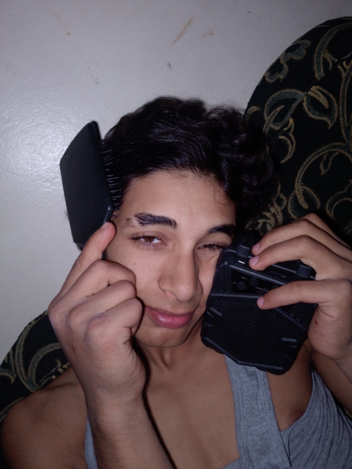 - "A young man poses playfully, holding a black comb against his head like a phone" by FM-OBPce2, licensed under CC BY 4.0