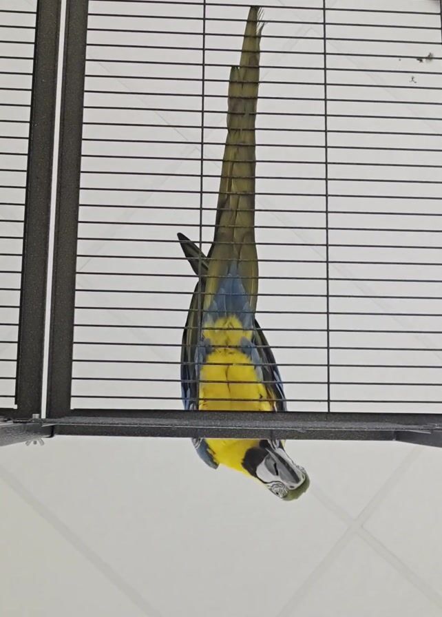 A parrot is hanging upside down in a bird cage. The parrot has blue and yellow plumage and a long tail, which trails to the top of the cage. The cage has closely spaced black bars and is sitting on a white tiled floor.