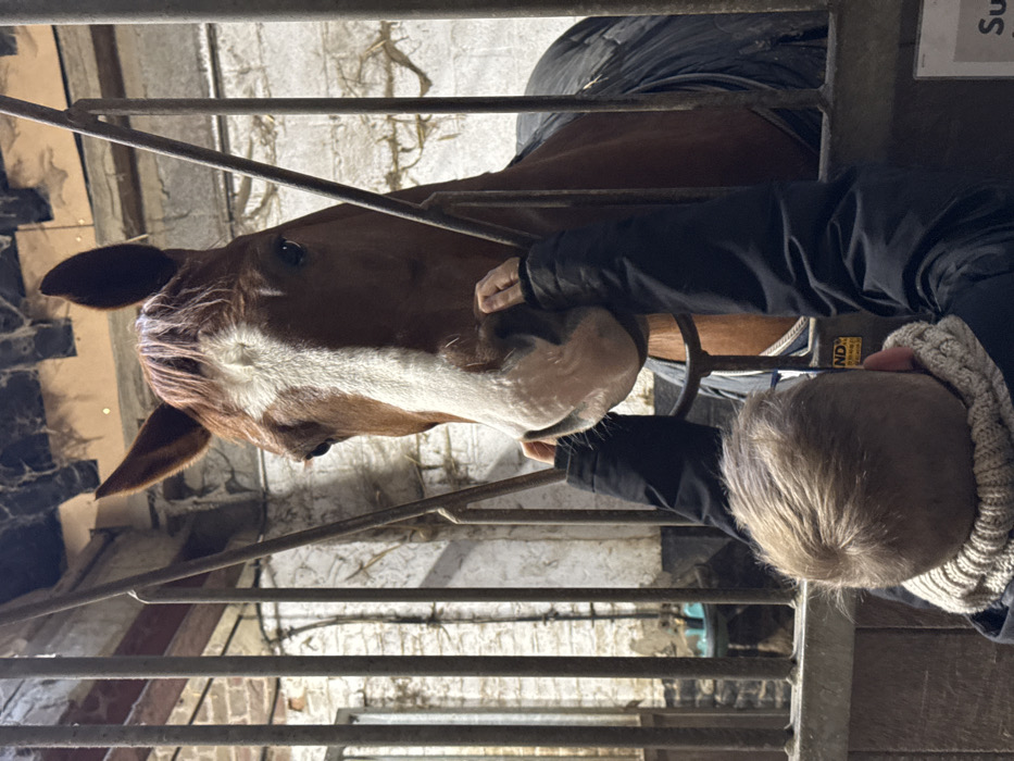 The image displays an indoor stable scene in Estaimpuis, Belgium, focusing on an interaction between a person and a horse
