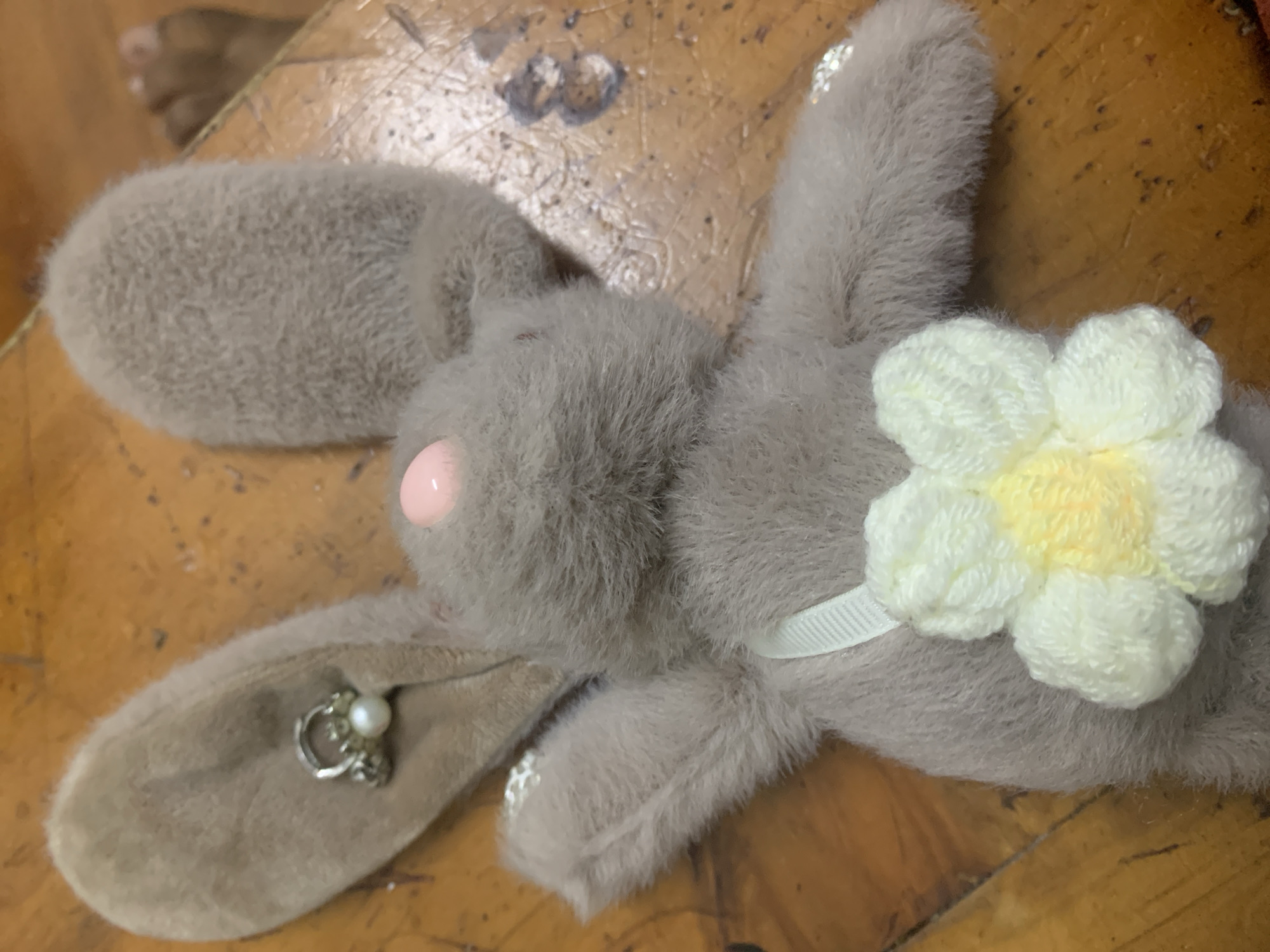 A grey plush bunny toy lies on a wooden surface. The bunny has one ear up and one ear down, with a faux pearl and metal embellishment on the down ear. A white and yellow yarn flower is attached to the bunny's body with a white ribbon. A pink dot represents one of the bunny's eyes. Part of a foot is visible in the upper left corner of the image. The photo was probably not taken in Dar es-Salaam, Tanzania.