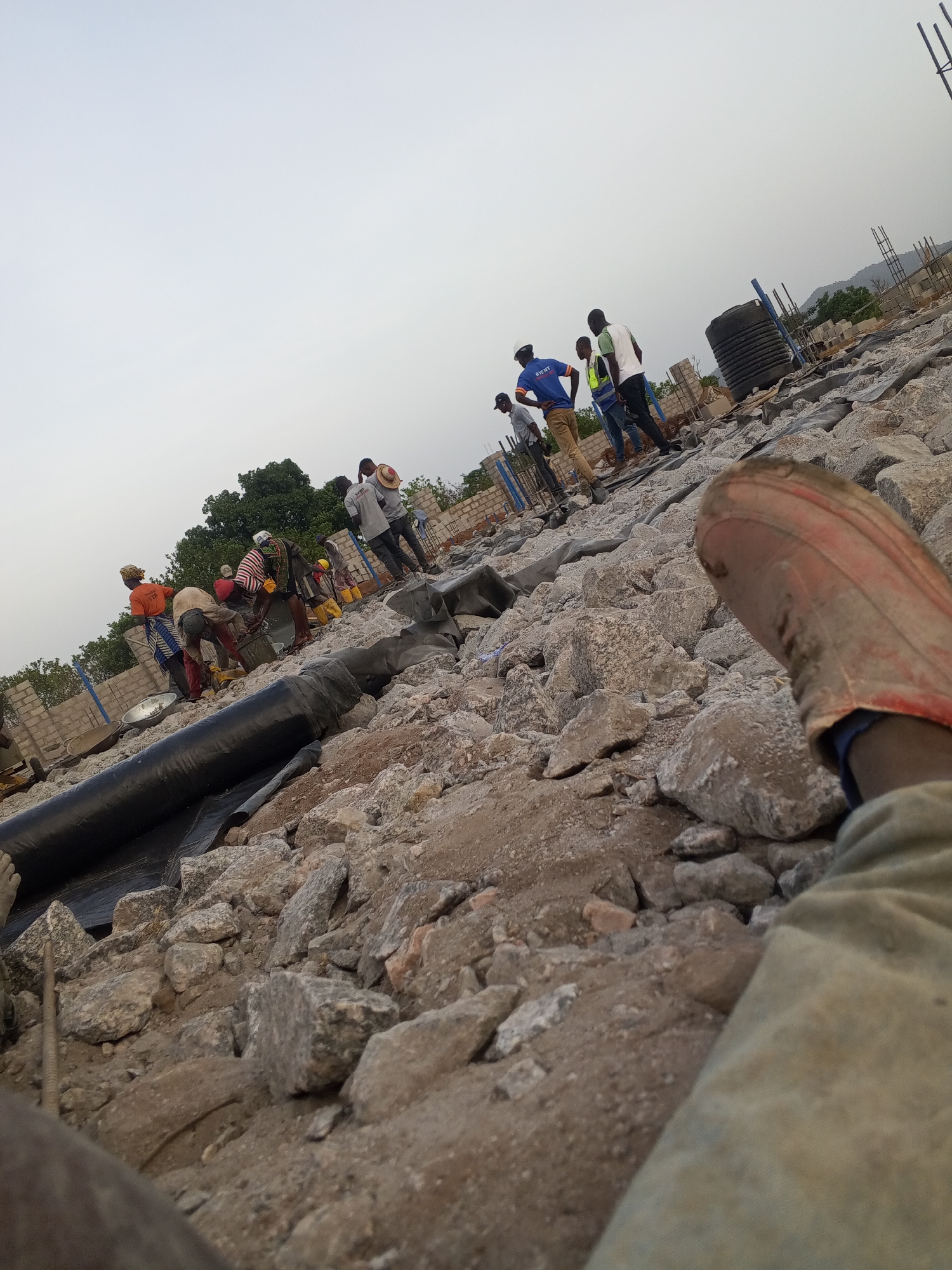 An active construction site in Zango-ndaji, Nigeria, is depicted under a pale, overcast sky. The immediate foreground shows the lower leg and red boot of an individual, indicating a low-angle perspective. The terrain is rugged, composed primarily of loose rocks, dirt, and construction debris. A thick, black pipe lies horizontally across the left-midground. Approximately 15 individuals, mostly adult males, are distributed across the scene. On the left, a group of workers is actively engaged in material handling: one person in an orange shirt and headwrap bends over, another in a light shirt and hat works near a container, and a third in a striped shirt stands over a rectangular bin. Various tools like shovels, buckets, and a wheelbarrow are present nearby. Partially constructed concrete block walls rise behind this group, with green foliage visible beyond. In the mid-right, a smaller group of men stands. One wears a blue t-shirt, khaki pants, and a white hardhat; another has a light green safety vest; and another a white t-shirt and straw hat. Further right, a large, black cylindrical water tank is positioned amidst exposed rebar structures and additional concrete block foundations. Distant hills with sparse vegetation are visible on the horizon beneath the sky. The overall scene indicates ongoing building activity with workers engaged in various stages of construction.