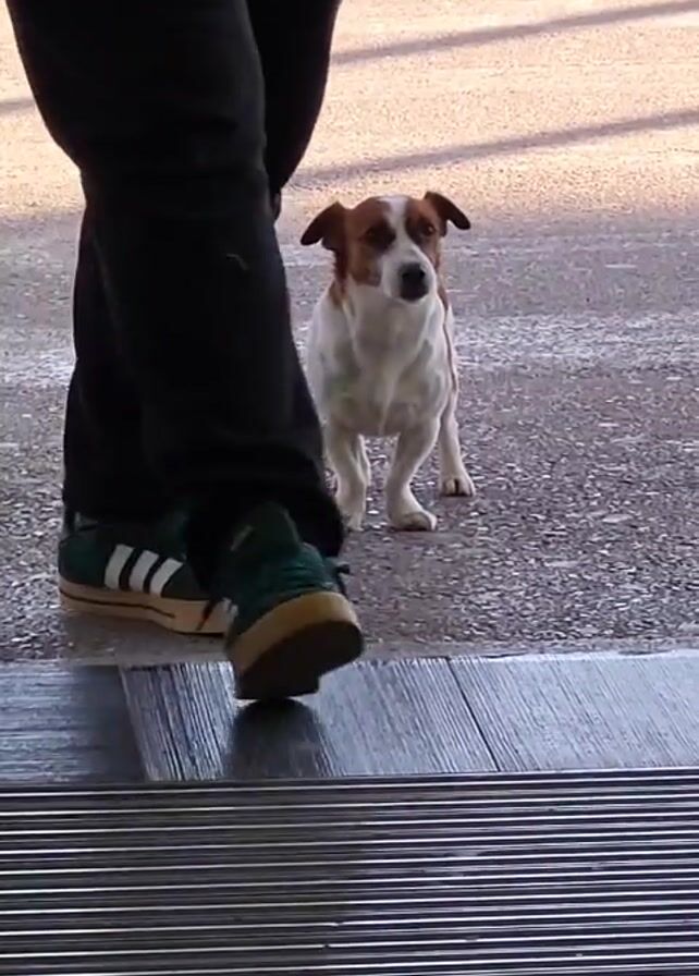 A person wearing black athletic pants and green Adidas sneakers steps onto a metal-slatted floor, opening a glass door to reveal a small, brown and white Jack Russell terrier standing on the pavement outside
