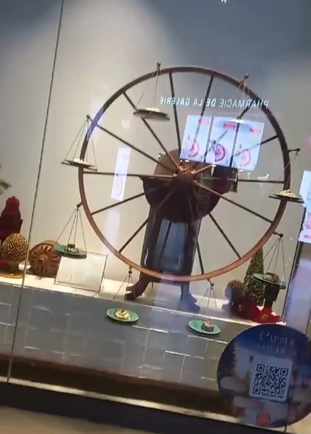 shop window display featuring a large, antique-looking scale balanced like a Ferris wheel. The scale has multiple pans hanging from its circumference, each holding a small, possibly decorative, item. The display also includes small Christmas trees, decorative objects resembling pine cones, and promotional materials. A QR code is visible on a sticker. The scene appears to be inside a shopping mall or commercial building, given the clean tile flooring and the presence of the shop window. The camera moves slightly, offering different views of the display.