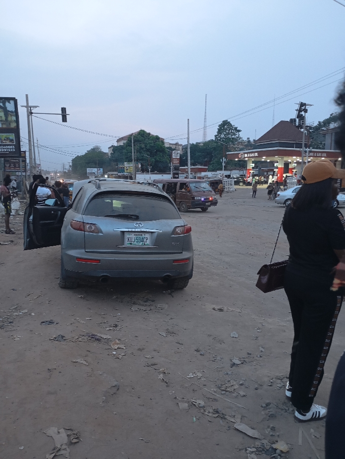 A gray Infiniti FX is parked on a dirt road, its door ajar. People mill around it. A brown van with flashing lights is in the middle distance, along with other cars and pedestrians. In the background, an O & Gas Oil filling station is visible. Overhead power lines traverse the scene, converging at a traffic light standard. A tall antenna rises in the distance. A woman stands in the right foreground, partially obscuring the view. The overall setting appears to be a busy, possibly urban area in a developing country.