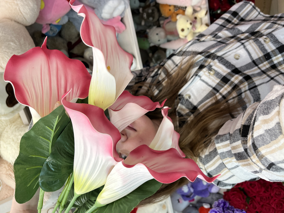 This image presents a close-up, slightly tilted view of an individual holding a bouquet of artificial flowers within a retail setting located in Chaikovsky, Russia. The person, visible from the chest upwards, has long brown hair and is wearing a white, black, and tan plaid button-up shirt. Their upper face, including the eyes, is obscured by five prominent artificial calla lilies, which feature white petals with distinct pink-red edges and yellow spadices, accompanied by green artificial leaves. A cluster of artificial red roses and purple flowers is partially visible in the lower-left corner. The background reveals white shelving units displaying various plush toys, including teddy bears and other stuffed animals in assorted colors, consistent with a flower and gift shop environment.