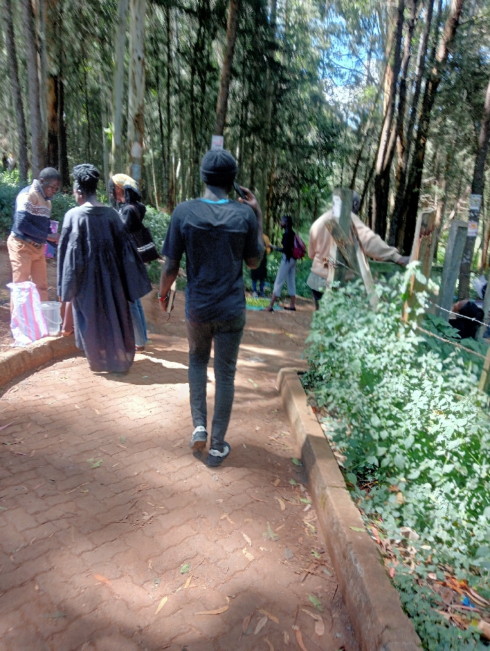 The image displays an outdoor scene on a paved pathway within a wooded environment in Waseges ward, Kenya