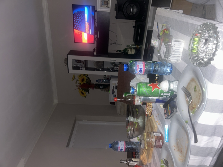 The scene depicts the interior of a domestic residence in Verinsko, Bulgaria, observed at what appears to be evening or nighttime. The primary focus is a rectangular table in the foreground, laden with remnants from a meal. On the table, covered by a striped tablecloth (white and light grey/blue), are multiple partially consumed white dinner plates, some containing food residue and equipped with forks. Beverages include two plastic bottles of Evian water, a green Heineken beer can, a silver Red Bull energy drink can, a clear bottle of spirits, and another brown bottle with a red cap. A large glass bowl holds salad with a serving utensil. Other items on the table consist of a jar of red spread, a small dish of nuts or similar snacks, a wooden cutting board, a pack of Marlboro Gold cigarettes, a black lighter, a white salt/pepper shaker, a clear plastic container, and a decorative glass ashtray. The background reveals a room with light-colored walls and white crown molding. To the left, a white door is visible. To the right, a tall white display cabinet with glass doors contains various items. Adjacent to this, a flat-screen television is mounted on a dark media console, displaying a news program with red and blue graphics and Cyrillic text, including "ЛОКОМОТИВ СОВИЯ СЕПТЕМВРИ". A black Sony speaker stands to the right of the television. On the console, there is also a bottle of Jameson whiskey, another bottle of spirits, a remote control, and a framed photograph. Above the console, a vase holds artificial sunflowers and red foliage. No individuals, actions, or direct interactions are observable within the depicted scene.