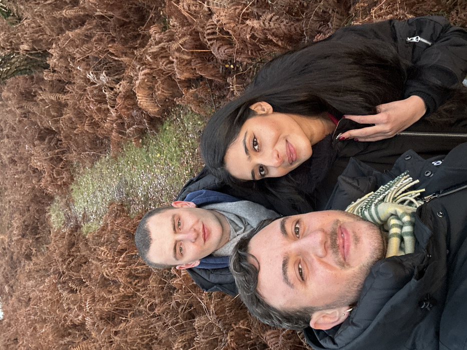 The image depicts three individuals, two males and one female, posing for a photograph on a narrow dirt path flanked by dense, dried, reddish-brown bracken. This setting is an outdoor natural area within Stafford, United Kingdom. The male subject in the immediate foreground, positioned slightly left of center, has short dark hair, a beard, and a light mustache. He wears a black puffer jacket and a green and yellow striped scarf, looking directly at the camera with a slight smile, suggesting he is holding the camera for a selfie. Behind him and to his right, a second male subject with short light brown hair wears a black puffer jacket over a blue hooded top and a grey scarf, also looking forward with a slight smile. To the foreground male's right, a female subject with long dark hair wears a black puffer jacket; her left hand, displaying red nail polish, rests near her jacket collar as she looks directly at the camera with a slight smile. The path, partially covered with sparse green growth, recedes into the background, winding through the uniform dried vegetation.