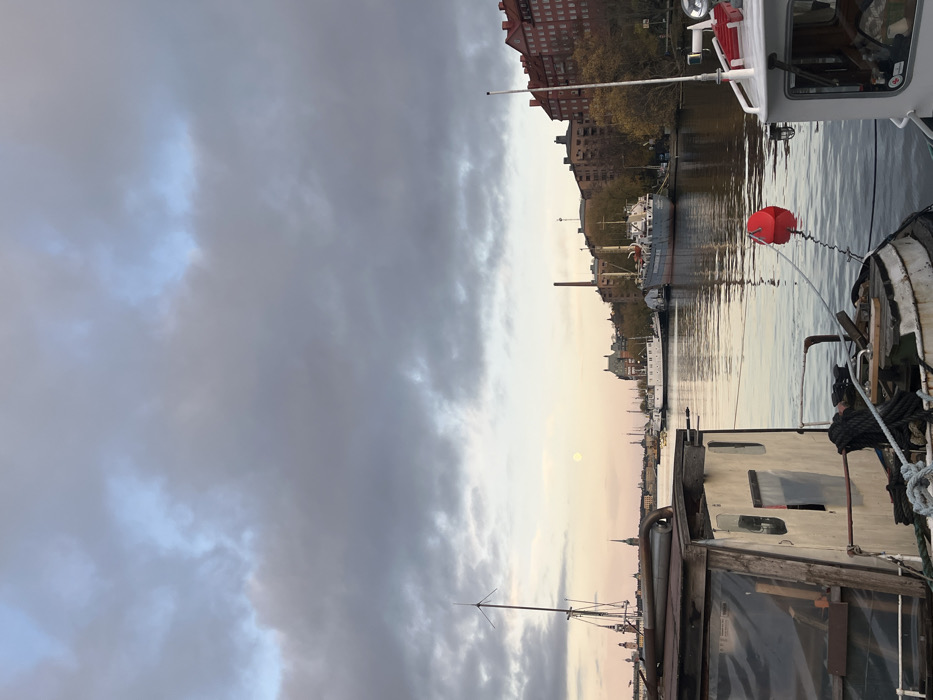 The image depicts a waterfront scene in Stockholm, Sweden, likely viewed from Söder Mälarstrand across Riddarfjärden, looking towards Gamla Stan/Riddarholmen on the left and parts of Södermalm/Långholmen on the right. The environment is characterized by an overcast sky dominated by large, dense gray clouds, with faint patches of lighter blue visible. A pale, circular celestial body, consistent with a full moon, is positioned low above the distant horizon in the mid-left, casting a subtle, diffuse light. The water in the foreground and midground is calm, reflecting the sky and distant structures. In the immediate foreground, to the left, is a partial view of a weathered, boxy boat or barge, possibly a house-boat. It features faded light-colored panels, a dark flat roof, and a cabin with a large window covered by a translucent material. Coiled dark and light-colored ropes are visible on its deck, alongside various fittings. Extending from behind this boat is a tall, slender mast or antenna with horizontal cross-bars. To the right in the foreground, the white bow section of another boat is visible, partially cropped, featuring a red railing. Between these two foreground vessels, a bright red cylindrical buoy floats on the water, tethered by a rope. In the midground, several vessels are moored along the distant tree-lined shore. A prominent gray cargo-type ship, possibly the M/S Sundbobo, is docked, with lighter reflections visible on its hull from the water. To its left, a larger white vessel is also moored. Farther left, other smaller boats are visible. The background reveals the cityscape of Stockholm. On the far left, multiple spires and distinct architectural silhouettes, including one resembling the Riddarholmen Church, identify the central city area. Along the right bank, a continuous line of multi-story buildings with red brick facades and red-tiled roofs are visible. Autumnal trees with yellow and orange foliage line this shore. A tall, slender industrial chimney stands prominently between buildings on the right-center horizon. No individuals or specific actions are discernible in the scene.