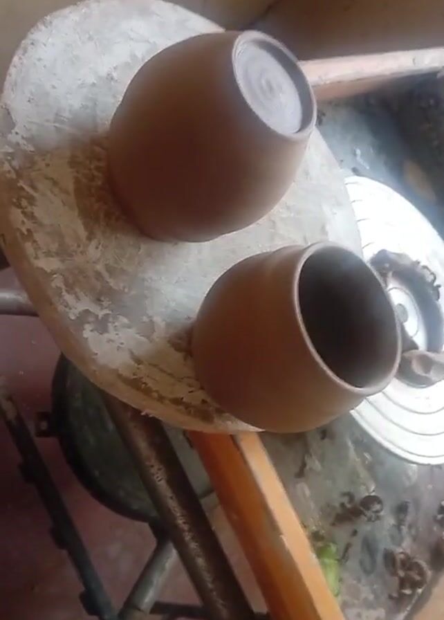 two small, unfired clay pots sitting on a pottery wheel. The wheel is old and has some paint chipping off. The pots are a light brown color and appear to be freshly made. One pot is open, showing a dark hollow inside, while the other is facing down, showing a spiral pattern on the bottom. There is some pottery equipment around the wheel, including a small metal disk. The video is shot from above.
