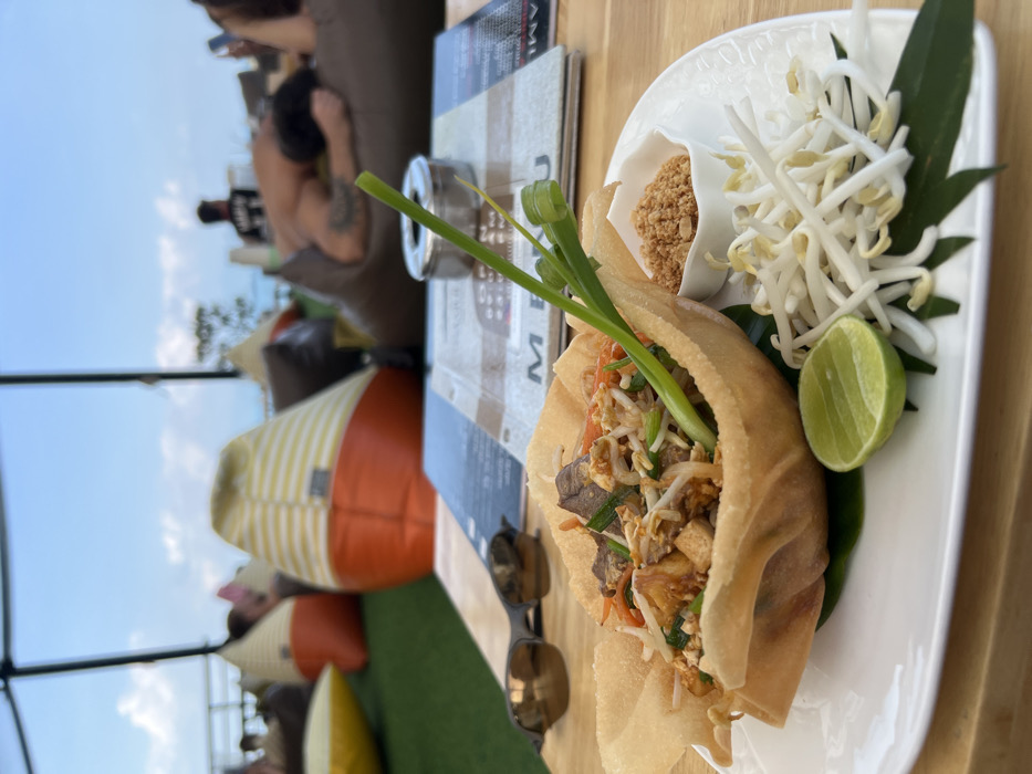 An outdoor, elevated lounge area in บ้านบางรักษ์, Thailand, is depicted during daylight hours under a blue sky with scattered clouds. The foreground features a light wooden table presenting a white rectangular plate. On the plate is a serving of Pad Thai, containing noodles, bean sprouts, peanuts, tofu, and meat, all contained within a large, deep-fried crispy noodle basket. Accompanying the Pad Thai are a small white bowl of crushed peanuts, a lime wedge, and a garnish of fresh bean sprouts and two green chives. A pair of dark sunglasses rests to the left of the plate. Directly behind the plate, a laminated menu or magazine titled "MENU" is open on the table, alongside a silver cylindrical ashtray. The midground and background show an artificial green turf floor furnished with numerous beanbag chairs in colors including brown, yellow, and orange with white stripes. Several blurred figures are seated or reclined on these beanbags; one shirtless male is prominently positioned on a brown beanbag, lying prone with a visible tattoo on his upper left arm. Black metal structural beams are visible against the sky. A body of water is discernible in the distant background.