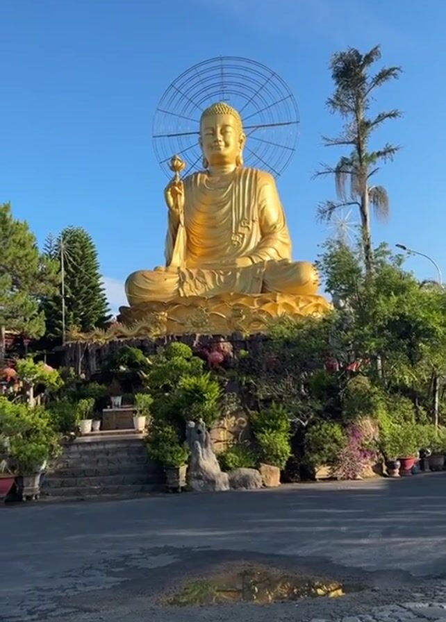 A golden, seated Buddha statue, holding a lotus flower, stands atop a landscaped hill against a clear blue sky. A decorative metal halo surrounds the Buddha's head. Lush greenery, including trees and flowering bushes, adorns the base of the statue, leading down to a set of stone steps. A concrete road with some water puddles stretches in front of the hill. A few buildings are visible in the background.