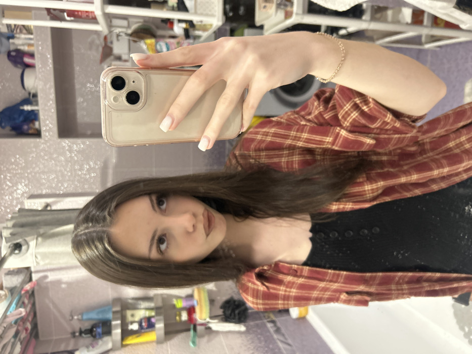 A mirror selfie captures a young female in a bathroom located in Kudrovo, Russia. The subject, possessing long, straight brown hair parted centrally, is depicted with her head angled slightly left, eyes directed upwards and left, and lips pursed with brown lipstick. She is attired in an open red and beige plaid flannel shirt layered over a black ribbed, button-front top. A delicate, light-colored bracelet is visible on her right wrist. She holds a light-colored smartphone, equipped with a clear case and two camera lenses, in her right hand, oriented to take the photo. Her nails are manicured with light-colored polish. The background, reflected in the mirror, shows a bathroom interior. The walls feature light purple or pinkish tiles, with an upper section exhibiting a subtle heart-shaped pattern. A white bathtub is visible on the left, above which a multi-tiered corner shelf unit holds various toiletries. A chrome shower curtain rod extends across the upper frame. To the right, a tall white metal shelving unit is filled with miscellaneous items, and the reflection of a white washing machine is discernible in the upper right background.