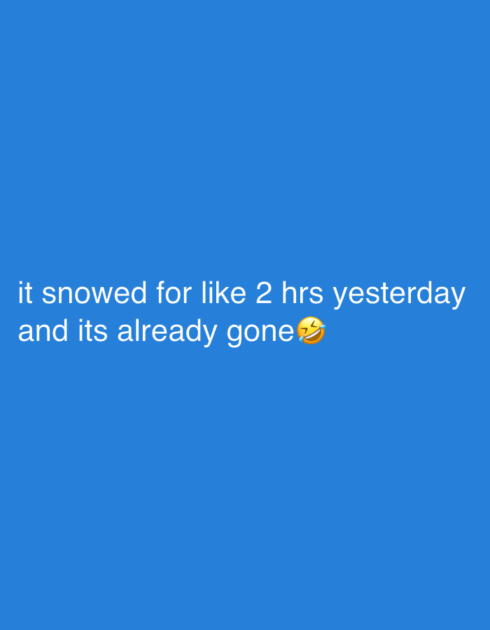 Text on a blue background reads, "it snowed for like 2 hrs yesterday and its already gone😂"