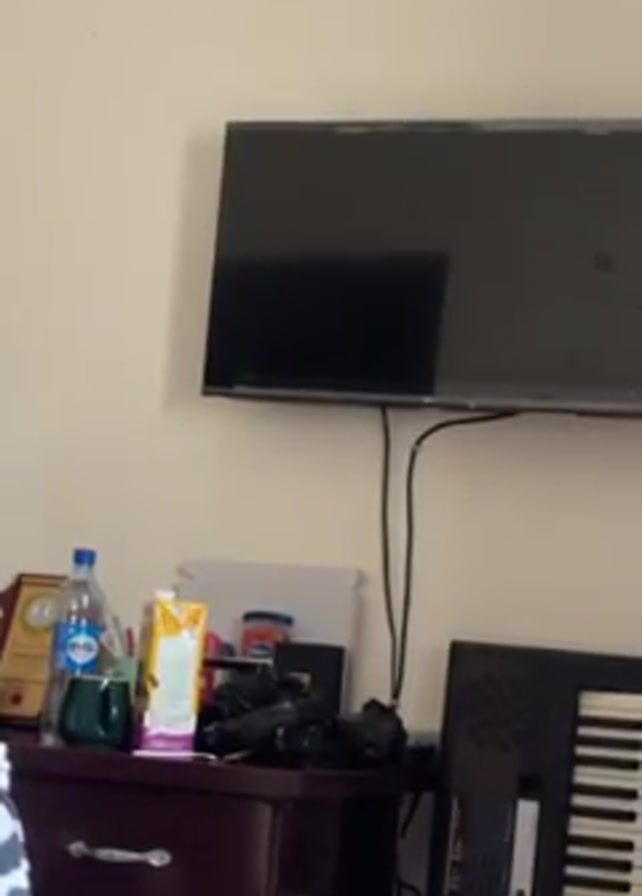 cluttered scene inside a room. A flat-screen TV hangs on the wall above a dark brown dresser with two drawers. On the dresser are various items, including a bottle of water, a green mug, a carton of juice, a white box, a small blue container, and a black plastic bag. Next to the dresser is an electronic keyboard.