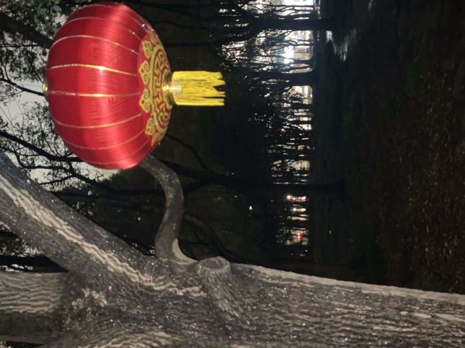 In the city of Yanqiao, China, a nighttime scene depicts a vibrant red Chinese lantern hanging from a tree branch