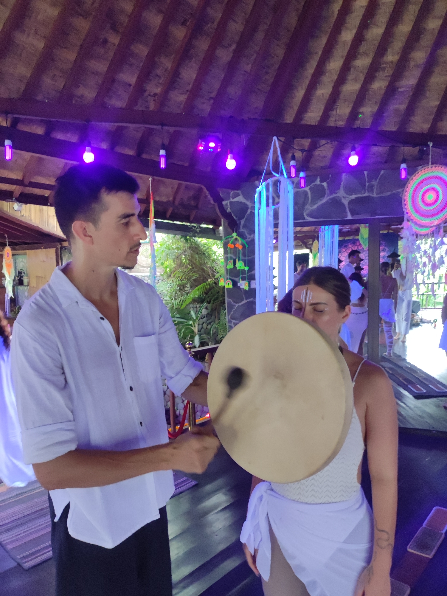 The image depicts an indoor/semi-outdoor ceremonial scene in Lokaserena, Indonesia. A Caucasian male, wearing a white collared shirt and dark trousers, stands on the left, holding a drum beater. He is in the act of striking a light-colored, round hand drum held by a Caucasian female positioned on the right. The female wears a white patterned halter-neck top and a sheer white sarong, with white markings across her forehead and nose bridge; her eyes are closed. The environment features a wooden beamed ceiling with hanging purple light bulbs, a stone wall in the background, and visible tropical foliage. Decorative elements include a large, multi-colored concentric circular art piece and white fabric streamers. Several other individuals, predominantly dressed in white, are visible in the deeper background. The flooring is dark, with light-colored mats present.