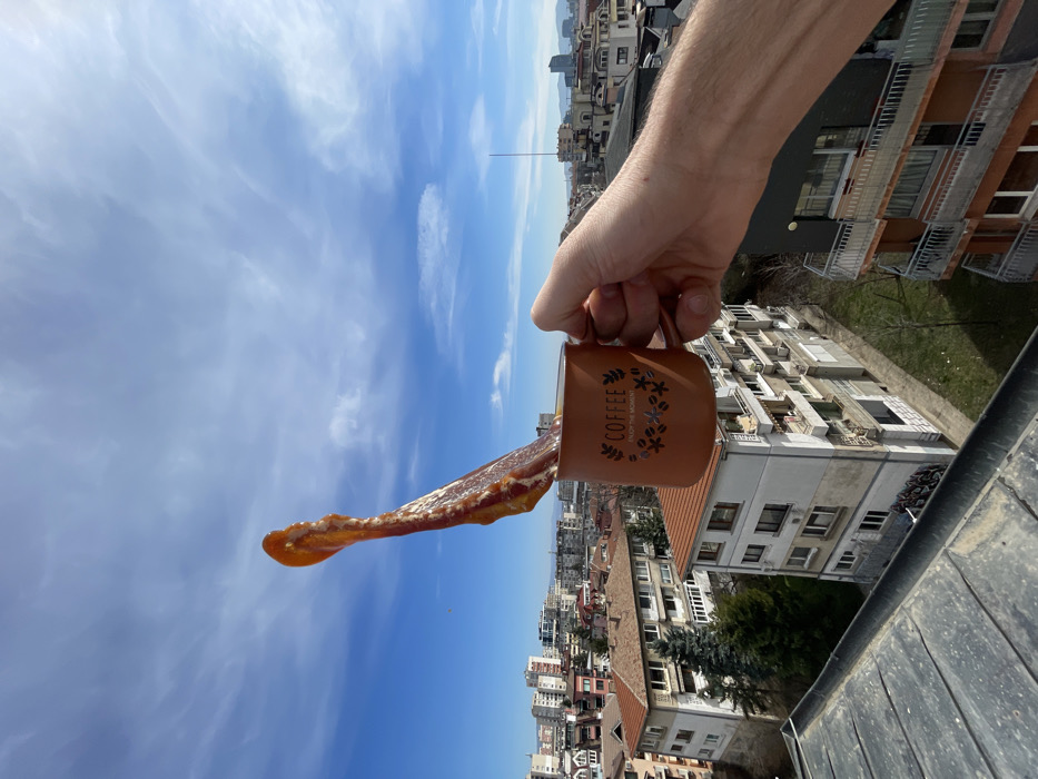 The image depicts an elevated daytime perspective over a residential area in Sofia, Bulgaria, characterized by multi-story buildings and distant mountains. In the immediate foreground, a light-skinned right hand holds an orange-brown ceramic mug with a metal handle. The mug features white text reading "COFFEE" above "ENJOY THE MOMENT," surrounded by stylized floral or coffee bean motifs. A viscous, reddish-brown liquid, consistent with coffee, is in motion, splashing dynamically upwards from the mug, forming a thick, curved stream that ascends against the sky. The top of the splash is a lighter, more translucent orange hue. Below the hand and mug, a dense urban landscape unfolds. Numerous multi-story residential buildings are visible, predominantly featuring light-colored facades (white, cream, grey) and red-tiled roofs. Many buildings exhibit balconies with metal railings. Patches of green vegetation and trees are interspersed between the structures. The foreground on the lower left shows a dark, textured, flat surface, likely a rooftop or balcony floor. In the far background, faint outlines of mountains, consistent with the Vitosha Mountain range, are discernible along the horizon, confirming the location as Sofia. A thin, tall antenna or mast extends vertically on the right side of the distant cityscape. The sky is clear blue with scattered, wispy white clouds. The scene is illuminated by bright, natural daylight.