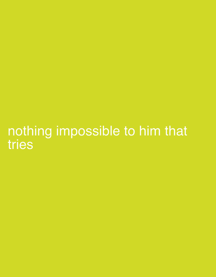 The image displays a solid chartreuse-green background. White, sans-serif text is centrally aligned in the lower-left quadrant, stating: "nothing impossible to him that tries". There are no discernible people, subjects, objects, actions, interactions, or environmental details within the image that would indicate a physical location in the city of Newark, United States, or any other specific real-world setting. The content is purely graphical.