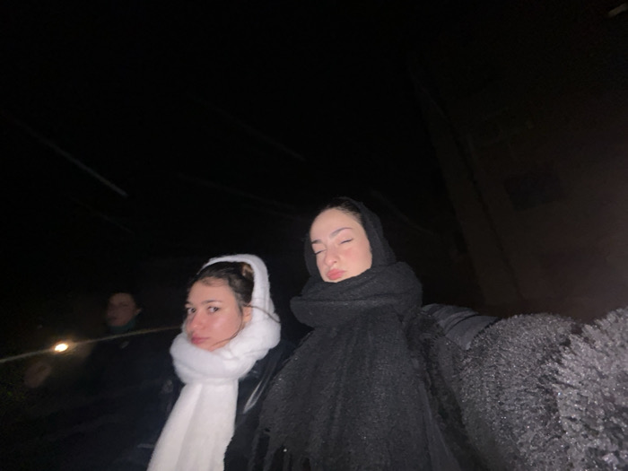 The image depicts three individuals in a nighttime outdoor setting, with two women prominently featured in the foreground and a third individual partially visible in the background. The scene is illuminated primarily by a direct light source, likely a camera flash, rendering the background in extreme darkness. In the immediate foreground, on the right, a woman with dark hair wears a black hood or head covering, a thick black textured scarf, and a dark, possibly faux-fur, coat. Her eyes are closed, and her lips are pursed in an exaggerated expression. Her right arm is extended, suggesting she is holding the camera. To her left, another woman with dark hair is visible, her head and neck enveloped in a thick white scarf or hood. Her face is turned towards the viewer, eyes open, with a neutral expression. She wears dark clothing beneath the scarf. In the blurry background on the left, a third individual is partially visible, appearing to wear dark clothing with a lighter-colored neck garment. A faint, distant light source is visible near this person. The environment consists of dark, indistinct structures, possibly buildings, faintly outlined against the black sky on the right and top portions of the image. The attire of the individuals suggests cold weather conditions. The precise location within the city of Strasbourg, France, cannot be determined from the visual evidence provided in this image due to the extreme darkness and lack of specific architectural landmarks or identifiable street features.
