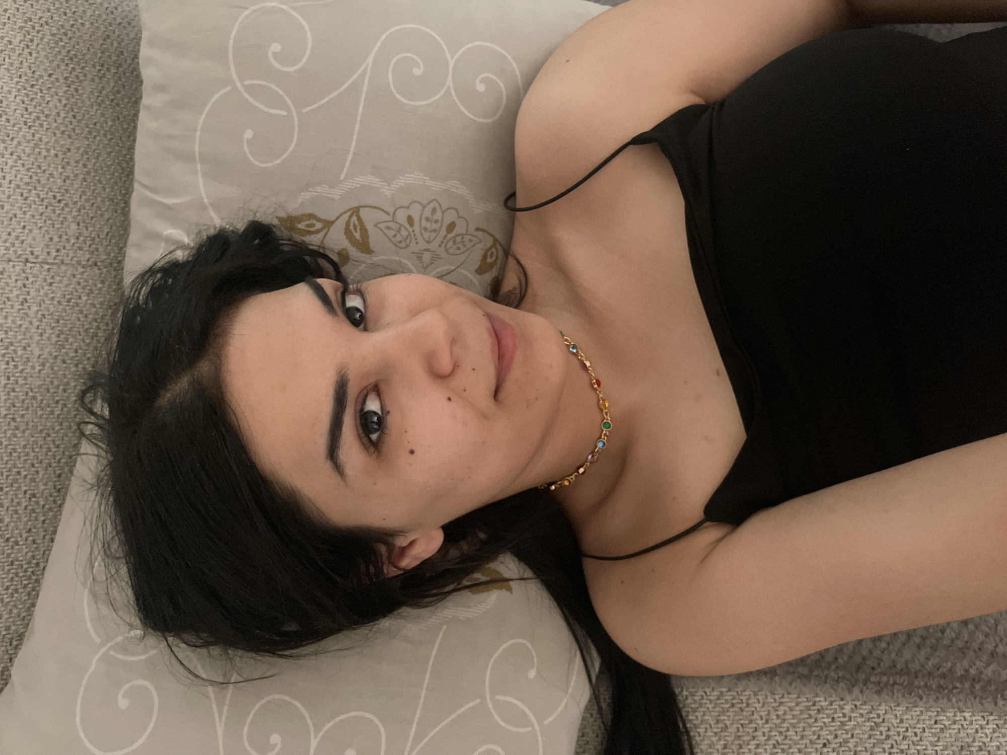 A young adult female is depicted in a close-up, overhead view, reclining indoors