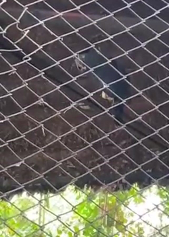 black bird in a cage. The cage is made of metal mesh, and the bird is perched on a branch inside. The cage roof appears to be made of natural materials. Outside the cage, green trees and foliage can be seen. The video appears to be taken at an eye-level perspective.
