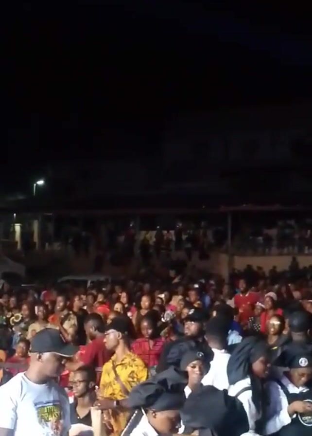 dense crowd of people at an outdoor event at night. Many individuals are wearing black hats and white shirts, while others sport casual attire. The crowd is loosely gathered, with some people appearing to interact in small groups. In the background, elevated seating is visible, packed with more attendees. Overhead lighting illuminates the scene, while the rest is dark.