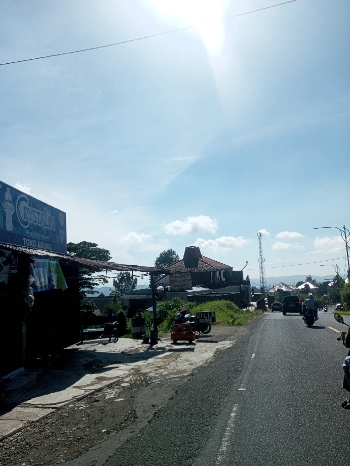 The image depicts a roadside scene under a clear, bright blue sky with scattered white clouds, illuminated by intense sun glare from the upper right. The location is Ka Thaung (Upper), Myanmar. In the foreground, to the left, a dark blue commercial sign for "Crystalin" and "Toko Agung" is visible, affixed to a building with a corrugated metal awning. Underneath the awning, in deep shadow, two indistinct individuals are present on a concrete surface next to a dark cylindrical object. Hanging fabrics or clothes are visible below the awning. The ground beneath the awning and adjacent to the road is a mix of rough concrete and asphalt. To the right of the concrete area, a paved two-lane asphalt road with a dashed white center line recedes into the distance, curving slightly right. An orange object, possibly a small vehicle or market stall component, is parked on the unpaved shoulder next to a black motorcycle. A white sign with the text "VILLA KANAN" is positioned nearby. Further back, on an elevated grassy mound, a building with a distinctive brown, multi-tiered roof and a sign reading "SERVIS... OLI & MOTOR SPAREPART..." is visible. A tall, gray cellular tower stands behind this building. On the road, several vehicles are observed heading away from the viewer, including a dark SUV or car and at least two motorcycles, one with a rider wearing a light-colored helmet and jacket. In the midground and background, additional buildings with red-brown roofs are interspersed among green trees, set against a backdrop of distant hills or mountains. Overhead, power lines traverse the sky, and a street light pole is visible on the far right.
