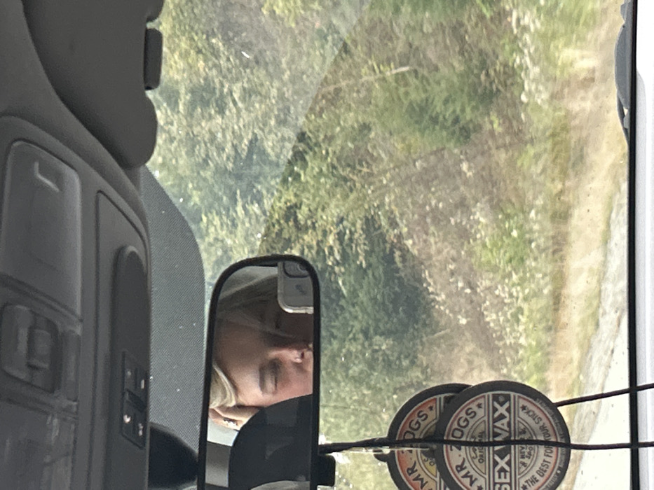 The image depicts a view from inside a vehicle, looking through the front windshield towards a natural, forested environment within Area D (Elaho/Garibaldi), Canada. Centrally positioned, the rearview mirror reflects the upper face of a young individual with blonde hair, eyes closed or partially shut, and a nose piercing on their left nostril. Their right hand, adorned with rings, is visible near their head. A white smartphone case is also reflected in the mirror. Two circular "MR. ZOGS SEX WAX" air fresheners or hang tags are suspended from the rearview mirror. Above the mirror, the vehicle's gray overhead console and headliner are visible. Through the windshield, a sloping hillside is densely covered with coniferous and deciduous trees, sparse undergrowth, and patches of lighter vegetation. A narrow, unpaved road is visible at the base of the hill in the distant background.