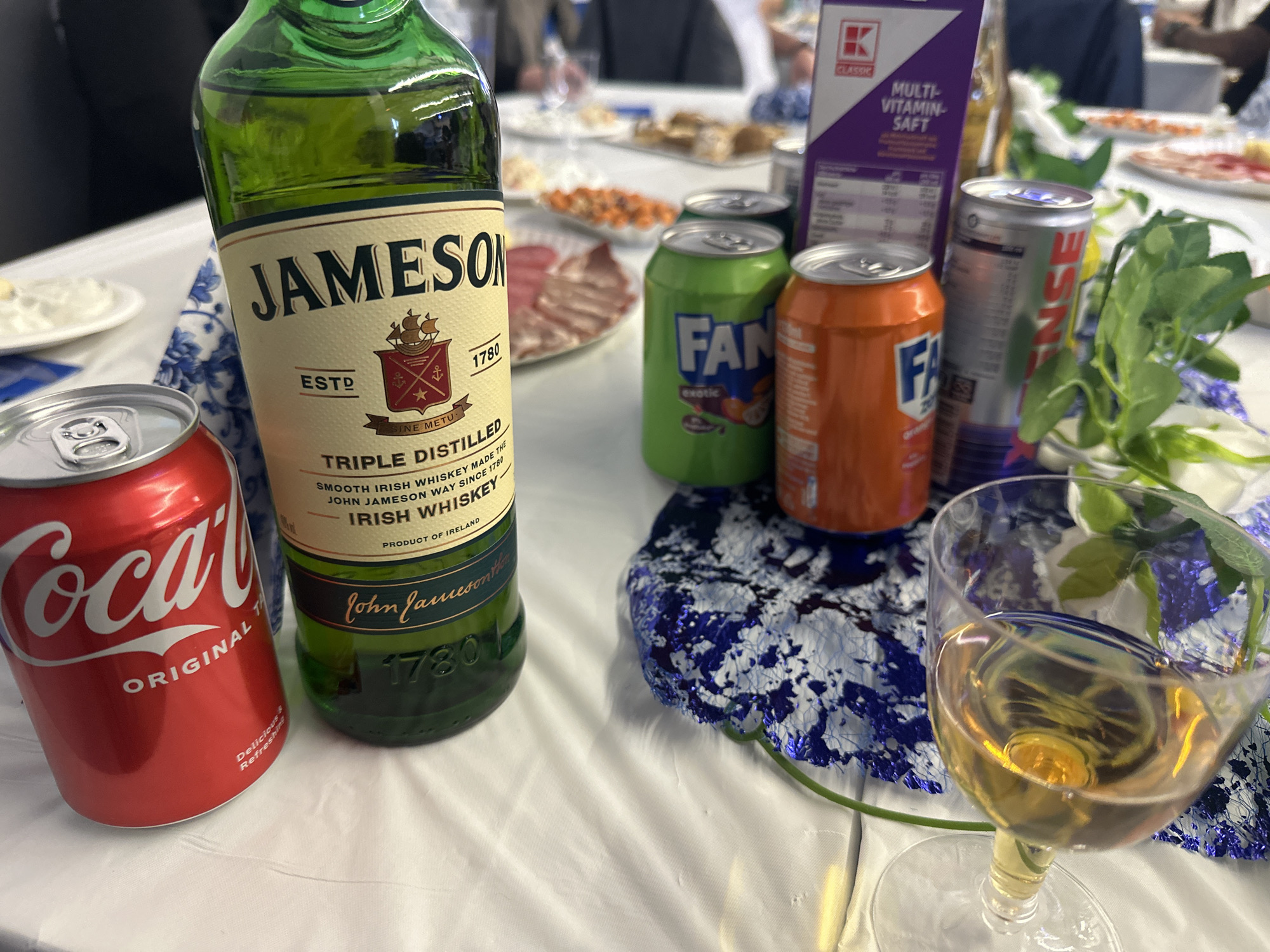table setting with various drinks and snacks. There is a bottle of Jameson Irish Whiskey, a can of Coca-Cola, a can of Fanta Exotic, a can of Fanta Orange, and a can of some other drink. A carton of Multi-Vitamin Saft is also present. A wine glass filled with a light-colored beverage is visible. Plates of food and other items are arranged in the background. The setting appears to be indoors, possibly a gathering or celebration. There is no location context as Trier, Germany visible in the image.