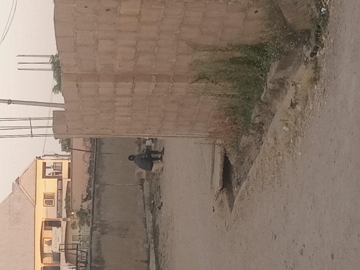 A slightly tilted view of a dusty alleyway between two buildings. The building on the left is a two-story structure with windows, while a tall concrete block wall forms the right boundary, showing vegetation growing out from its side. Further in, a person in dark clothing is visible in the center of the alley, appearing to be sitting. Overhead wires are strung from poles on the left. The overall atmosphere suggests a semi-urban, somewhat run-down area.