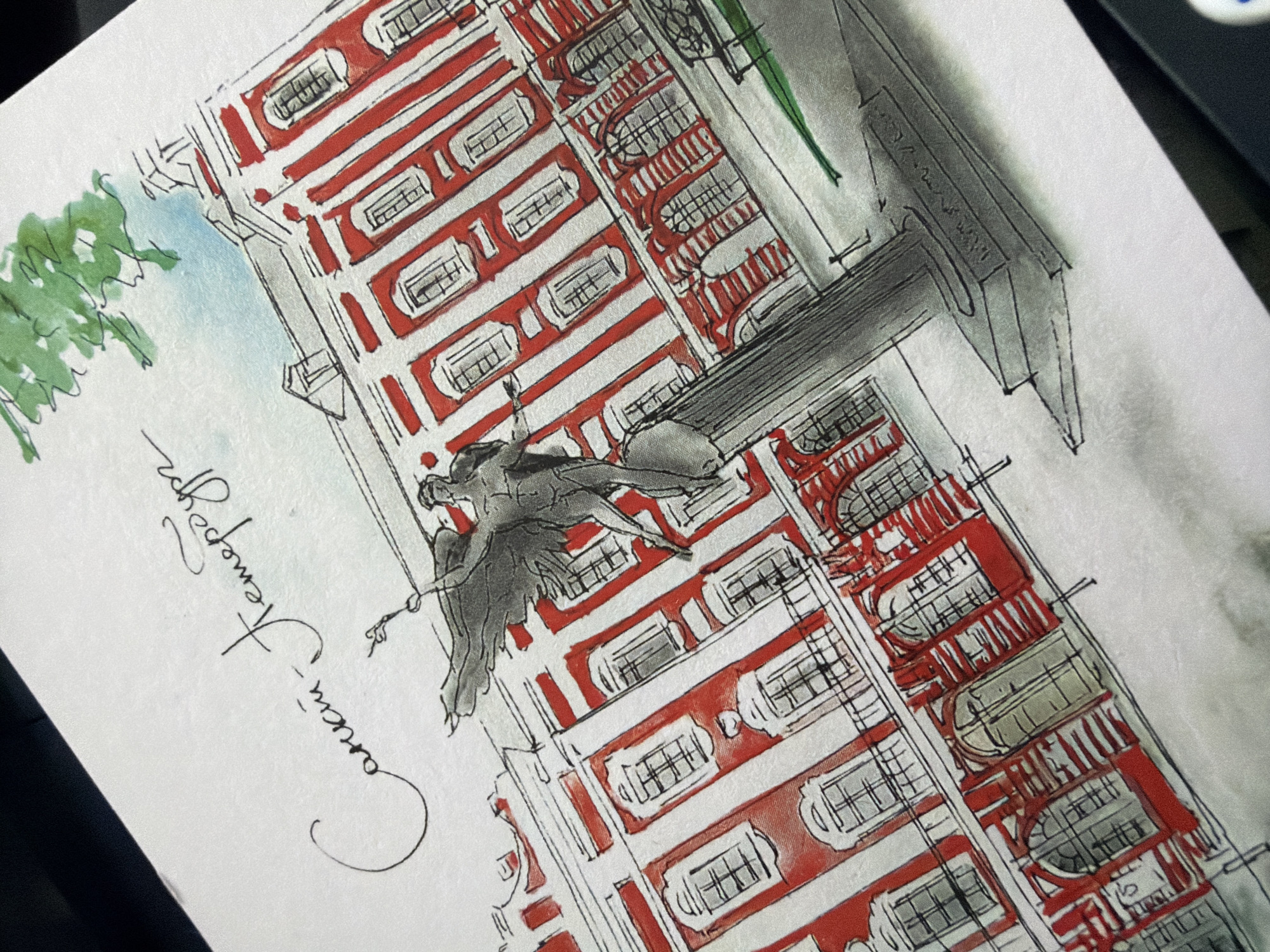 The image displays a watercolor and ink sketch on white, textured paper, positioned at an oblique angle