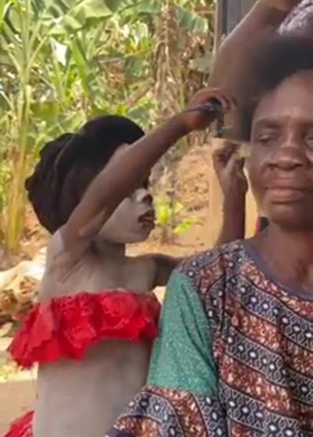 three people in an outdoor setting. One person, presumably a child, is dressed in a red outfit with lace trim and has their skin painted gray. They are standing behind an older woman, using a comb to style her hair. Another person stands behind the older woman, also combing her hair. The older woman is wearing a patterned shirt. There are green banana trees in the background.