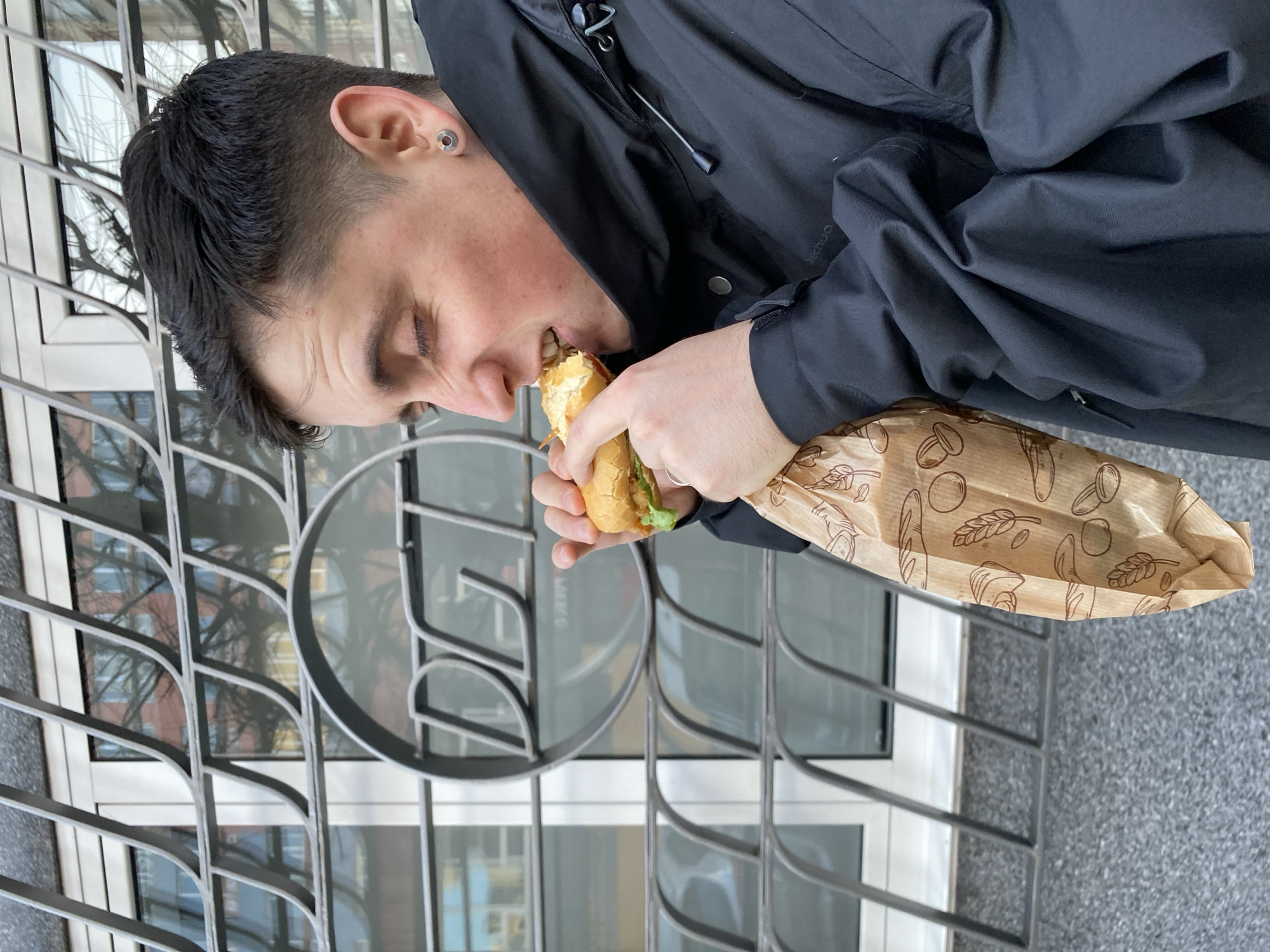 An individual is shown in profile, actively consuming a sandwich outdoors in Gijón, Spain