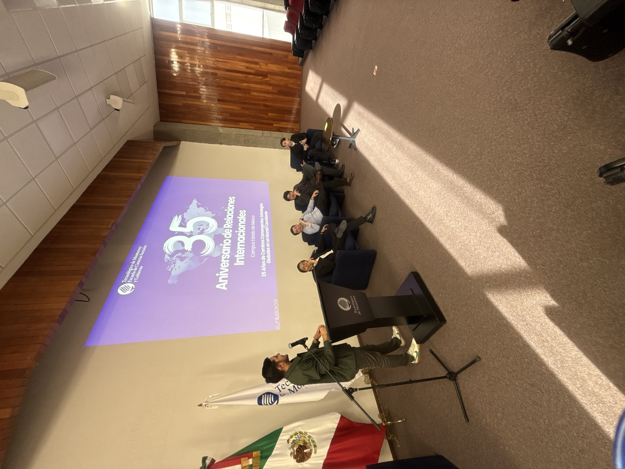 The image captures an indoor academic or professional event in Ciudad López Mateos, Mexico. A male presenter, dressed in a dark green jacket, dark trousers, and light-colored sneakers with green accents, stands behind a black podium with the "Tecnológico de Monterrey" logo on the left side of the frame. A microphone on a stand is positioned in front of him. To the left of the podium, a Mexican flag and a white flag with the Tecnológico de Monterrey logo are displayed. Four males are seated in blue upholstered armchairs arranged in a semi-circle to the right of the presenter. They are dressed in business casual attire and face the presenter, with one individual holding a clear water bottle. A small, dark-topped round coffee table with a metal base is situated in front of the seated group. The background features a large, purple-hued projection screen on an off-white wall, displaying text that includes "35 Aniversario de Relaciones Internacionales," "Tecnológico de Monterrey Escuela de Ciencias Sociales y Gobierno," and "Campus Estado de México." The right wall is clad in vertical wooden paneling, with large windows allowing natural light to enter, casting distinct diagonal shadows on the brown-speckled carpeted floor. A grey concrete column stands between the back and right walls. On the far right, rows of unoccupied auditorium-style seats with red fabric are visible, some with black bags placed beneath them. The ceiling is a white grid-panel design with two ceiling-mounted ventilation units or fans.