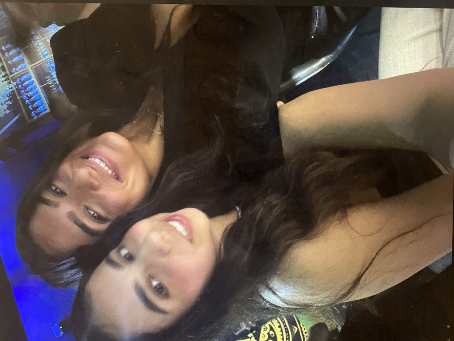 Two smiling women pose closely together, their faces tilted. The woman on the left wears a dark top with a necklace. To her right, another woman with long, dark hair and a necklace smiles, her shoulder visible. Part of a decorated object is seen in the lower part of the image. The background shows hints of a room with bluish lighting and furniture.