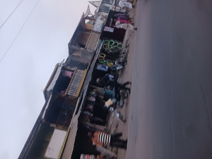 A tilted street scene shows a row of narrow, multi-story buildings crowded along the left edge. These structures appear to be shops or homes, stacked vertically. The right side of the image is dominated by a grey road surface. People and motorcycles are scattered around the shopfronts and on the edge of the road. There are some visible wares, including colorful hoops and various parts. The sky is overcast.