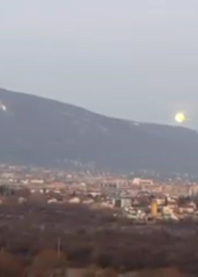 The camera zooms in on a full, yellow moon rising in a pale blue sky. In the foreground is a city landscape with buildings and trees, and a large, forested mountain is in the background. The mountain has snow on its peak.