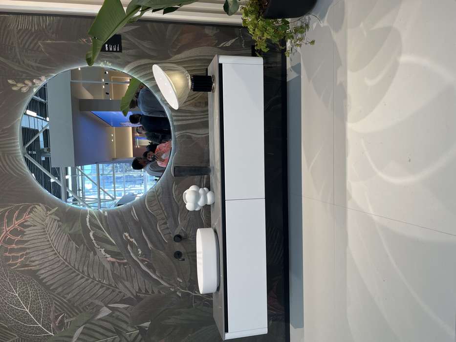 This image captures a modern bathroom display within an exhibition booth at the Bologna Exhibition Centre (BolognaFiere) in Bologna, Italy. The primary subject is a white, two-drawer floating vanity cabinet topped with a dark grey countertop, set against a wall featuring dark green tropical leaf-patterned tiles or wallpaper. A white, circular vessel basin is positioned on the left side of the countertop, with two black, wall-mounted faucet controls above it. Centered above the vanity is a large, circular mirror with integrated backlighting. On the right side of the vanity countertop, three distinct objects are arranged: a white, sculptural, cloud-shaped decorative item; a tall, dark grey rectangular vase-like object; and a table lamp with a black base and a translucent, upward-facing, bowl-shaped shade. A potted plant with broad green leaves and trailing vines is visible on the far right, beside the vanity. The floor is composed of light grey large-format tiles. The mirror's reflection reveals a busy exhibition environment with multiple individuals, architectural elements such as structural beams and large windows, and a sign displaying "CAPRI." One person, dressed in a pink top, is clearly visible in the reflection, holding a smartphone, indicating they are taking the photograph. The scene is well-lit, characteristic of a trade show or professional showroom.