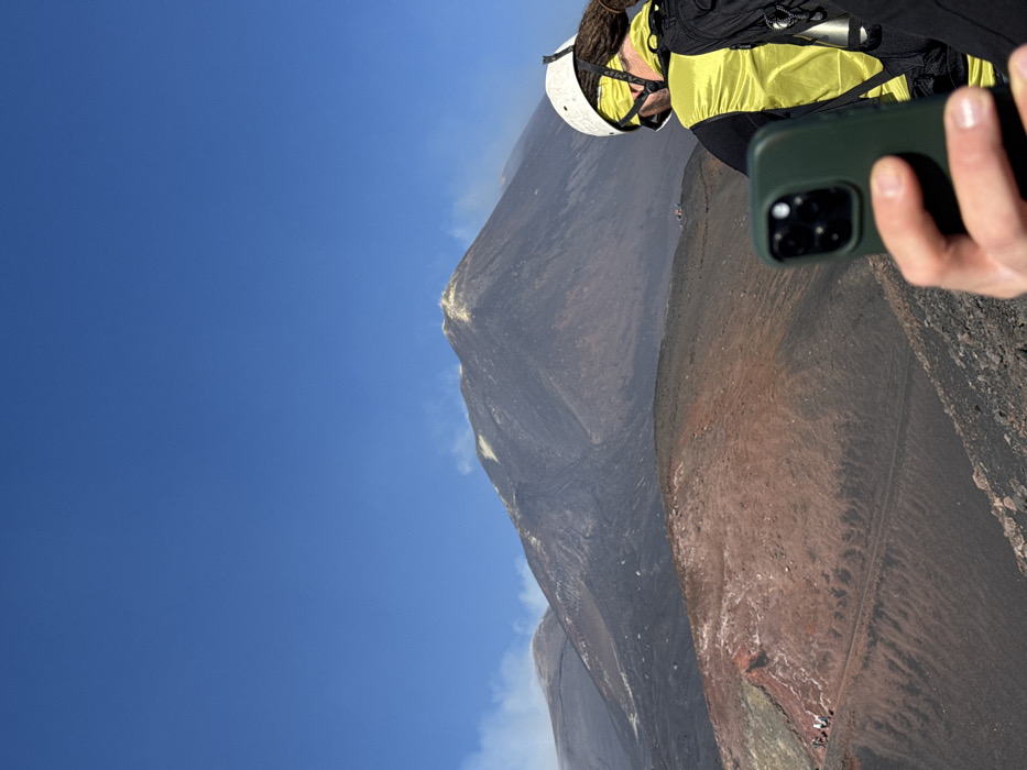 - "A person is captured from behind, holding a dark green-cased smartphone in their right hand, pointed towards an active volcanic landscape" by FM-DjxGb2, licensed under CC BY 4.0