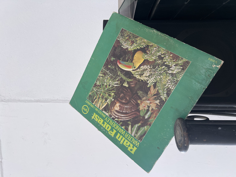 A record album titled "Rain Forest" by Walter Wanderley, Brazils No. 1 Organist, is shown at an angle. The cover features a toucan in lush vegetation, and a ceramic statue. The album is propped against a black speaker. The background is white, potentially a wall. The record's catalog number, V-8658, is visible in the upper right corner.