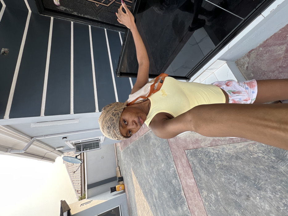 A woman poses outdoors. She wears a headscarf, yellow top, and floral shorts. One arm is raised beside a dark door with white stripes. The other arm is extended toward the camera. The background includes a building with a satellite dish, and a gray patterned ground.